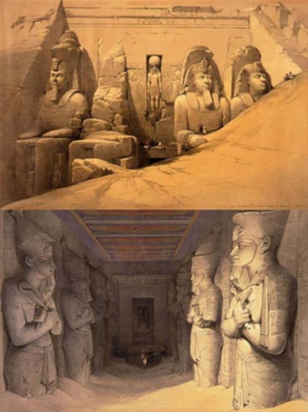 Top: picture of a print from David Roberts' Egypt & Nubia, issued between 1845 and 1849, showing the Great Hall of Abu Simbel buried in sand. (Public Domain) Bottom: Picture of a print from the same source, showing the Great Hall of Abu Simbel buried in sand. (Public Domain)