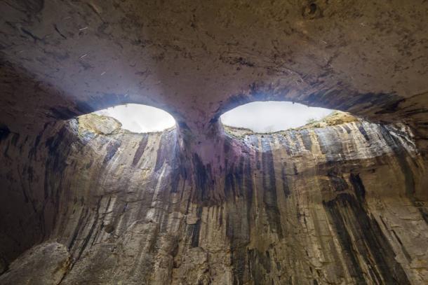 ‘The Eyes’ in Prohodna Cave with remnants of rain water trickling down the walls. (Lucian Bolca /Adobe Stock)