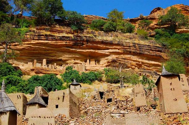 Situated in a remote corner of Mali, the Cliff of Bandiagara is a sandstone cliff which reaches up 500 meters (1,640 ft) and continues for over 150 km (93 mi). Said to have been occupied for at least 2,000 years, the cliff shelter has been used as the site of villages, mud-built granaries, altars, rock art and ritual customs of the Dogon people, and the Tellem and Toloy people before them, along with their unique architecture. (AWU / Adobe Stock)