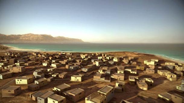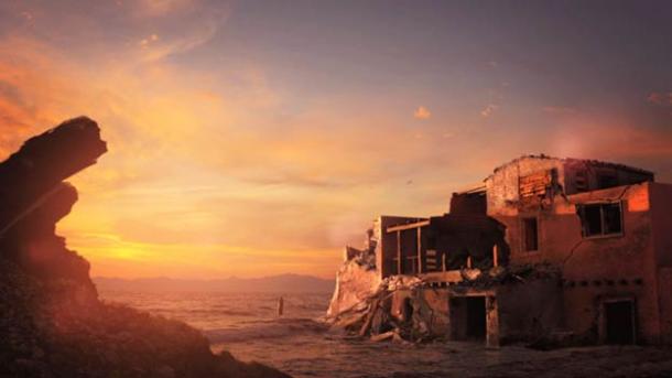A digital reconstruction of the buildings at Pavlopetri being submerged by the sea about 1100 BC. (Pavlopetri Underwater Archaeology Project)