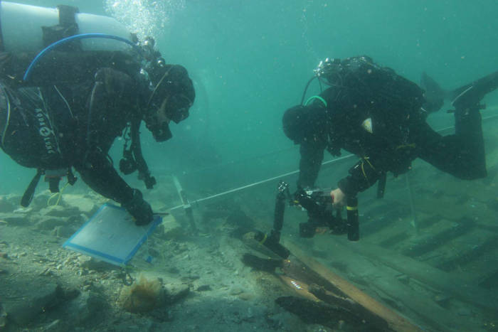 Underwater archaeologists carefully documenting the ship's structural details. (A. Divic/ICUA)