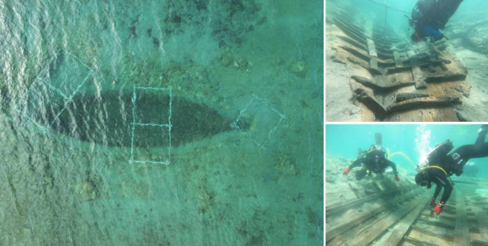 Top image: Aerial view of the completely excavated Roman vessel showing its impressive 12.5-meter length. Source: R. Shultz/ICUA