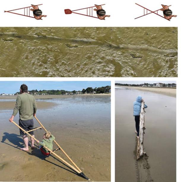 To help interpret these features, we conducted a series of tests on mud flats both in Dorset, UK, and on the coast of Maine, US. We used different combinations of poles to recreate simple, hand-pulled travois.