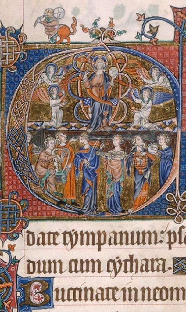Image from the Gorleston Psalter, with Medieval musicians on the bottom, Christ above. (Public Domain)