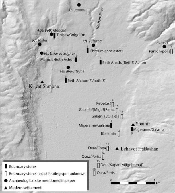 Map of Boundary stones in the northern Hula Valley. (R. Sabar/ Palestine Exploration Quarterly)