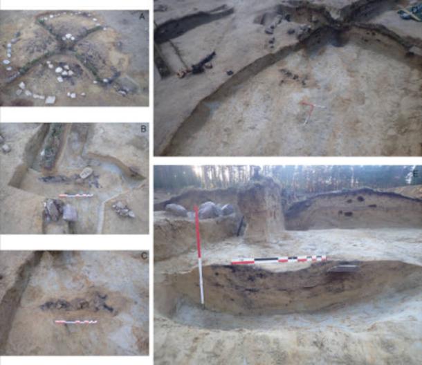 Photographs of different stages of the excavation from the top of the cremation layer in mound A140 (A) to when grave A4367 was identified (B) and uncovered (C & D), and during excavation and documentation of the grave (E). The runic stone is visible in the section shown in E. Notice the depth of A4367 compared to the cremation layer in A140. (Museum of Cultural History/Steinar Solheim et al./Antiquity)