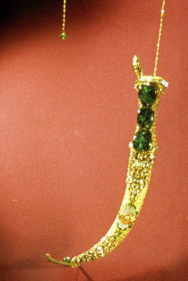 The Topkapı Dagger, with a 35 cm (14 in) long scabbard is largely made of gold, set with jewels. A clock is built into the pommel of the dagger. There are three large emeralds on the handle. Imperial Treasury of the Topkapı Palace in Istanbul, Turkey. (Hajotthu/CC BY-SA 3.0)