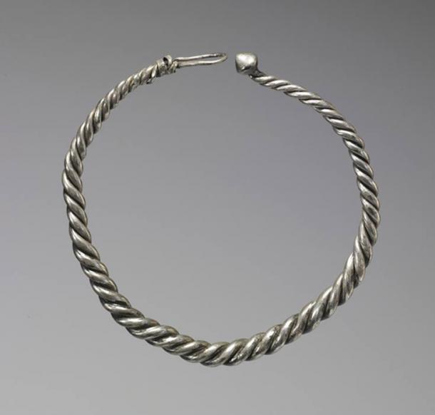 This Viking neck ring is made from three twisted silver wires and is fastened by an unusual conical knob and loop clasp. It was both jewelry and money to its owner. Large neck rings and smaller arms rings were buried in Viking hoards in Ireland, Scandinavia, and England, all important hubs of Viking sea trade. This neck ring was found buried with a plain arm ring (present location unknown), in Fenit, County Kerry, Ireland in 1880. (Public Domain)