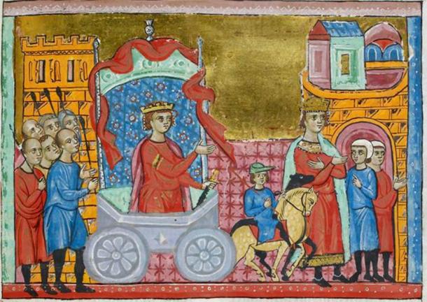 Framed miniature of King Jugurtha paraded through Rome as a prisoner (left), while King Boctus makes peace with the Romans (right). (Public Domain)