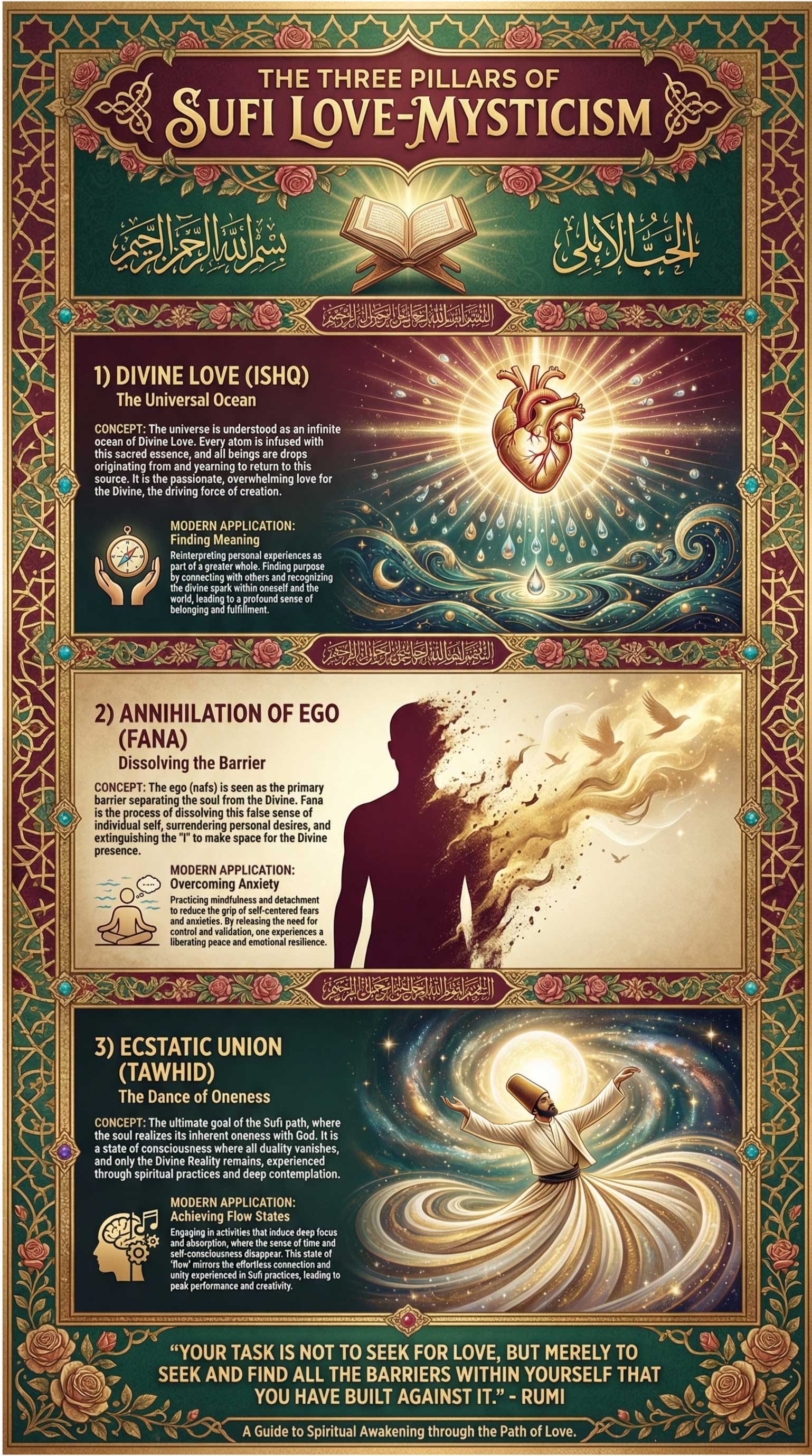 2. Annihilation of the Ego (Fana) The ego (or *nafs*) is the primary barrier to experiencing divine love. Through spiritual practice, it must be dissolved.