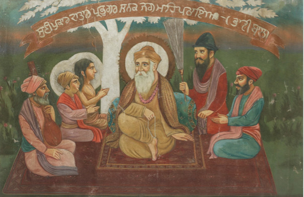 Top image: Painting of Guru Nanak seated beneath a tree with his two sons (Sri Chand and Lakhmi Das), Bhai Mardana, Bhai Bala, and possibly Bhai Lehna (future Guru Angad). Source: Public Domain