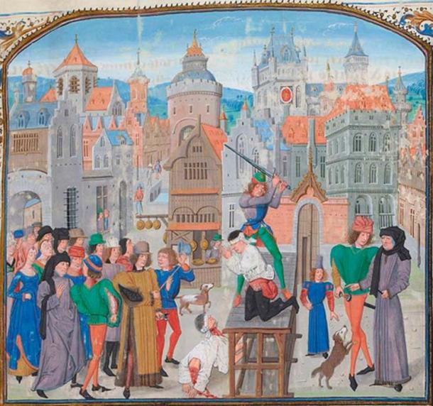 Guillaume Sans, lord of Pommiers, is executed in Bordeaux on the orders of Thomas Felton, the city's English seneschal. Jean Froissart, Chronicles, fol. 1. Flandres, Bruges 15th Century. (Public Domain)