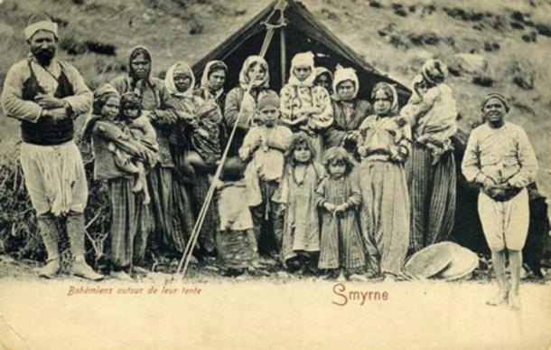Pre-1903 postcard of group of Roma gypsies in front of their tent in Smyrne. (Public Domain)