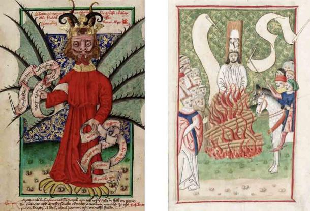 On the left, a depiction of the devil selling indiulgences from the Jena Codex (Public domain). On the right, the burning of Jan Hus at the Council of Constance, an action which set the stage for the Hussite Wars. (Public domain)