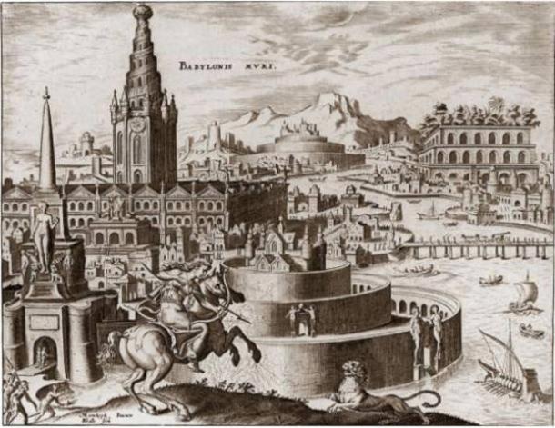 Top image: Hand-colored engraving of the Hanging Gardens of Babylon (19th century).
