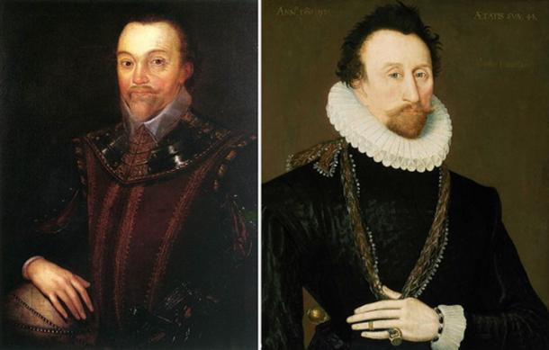 [Left] Sir Francis Drake in Buckland Abbey 16th century, oil on canvas (Public Domain), by Marcus Gheeraerts the Younger, [Right] Sir John Hawkin (Public Domain)