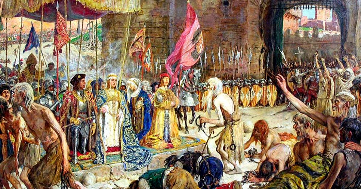 Top image: The liberation of prisoners in Malaga by the Catholic Monarchs, as part of the Reconquista in 1487. Source: Public domain