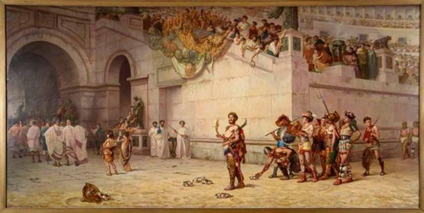 The Emperor Commodus Leaving the Arena at the Head of the Gladiators, by American muralist Edwin Howland Blashfield. (Public Domain)