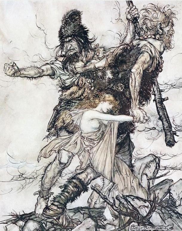 Scene from Richard Wagner's opera Das Rheingold , illustrated by Arthur Rackham (1910). The giants Fasolt and Fafner abduct Freia after Wotan fails to pay them for building Valhalla. (Public Domain)