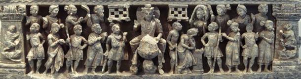 Scene of the Buddha's Great Departure from palatial life. Gandahara 1-2nd century. Guimet Museum. Personal photograph 2005. This scene depicts the "Great Departure" predestined being, he appears here surrounded by a halo, and accompanied by numerous guards, mithuna loving couples, and devata, come to pay homage. (CC BY-SA 3.0)