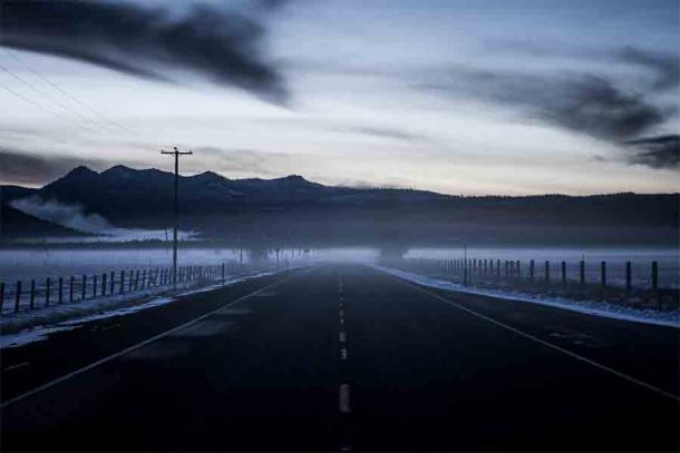 A dark foggy road at Crater Lake in Crater Lake National Park in Oregon suggests that there is light (the sacred) and darkness (unexplained phenomena) at this ancient and disturbingly mysterious location. (jdphotopdx / Adobe Stock)