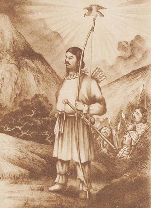 Emperor Jinmu (Jinmu tennô), from the series Mirror of Famous Generals of Great Japan (Dai nihon meishô kagami). Woodblock print (nishiki-e), ink and color on paper (1880). (Public Domain)