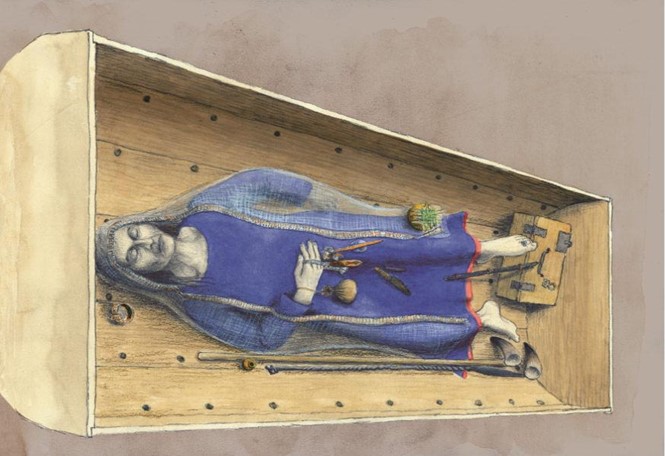 ‘At the time of burial the woman was dressed in fine blue and red clothes adorned with gold thread – which had royal status. She was buried, like the richest women, in the body of a horse-drawn carriage. She had been given ordinary female gifts, like spindle whorls and scissors. But there were also exotic goods from foreign parts, indicating that the woman must have been wealthy. She wore toe rings of silver, which have not been found elsewhere in Scandinavia. In addition, two bronze bowls were also found in the grave, which may have come all the way from Central Asia.’