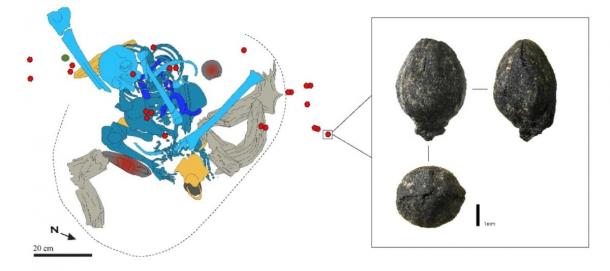 A drawing shows the placement of Individual 14’s bones, artifacts, and Ephedra cone bracts within the burial pit, alongside a photo of archaeological Ephedra bracts. (Morales, J. et al., Sci Rep (2024)