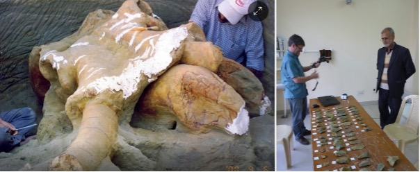 Top image: Indian scientists survey Palaeoloxodon (elephant) fossil and stone tools excavated nearby.
