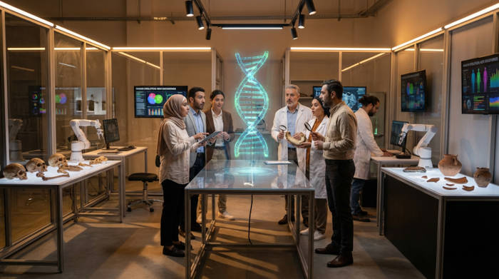 Top image: Image of scientists in an anthropological laboratory. Source: AI Generated