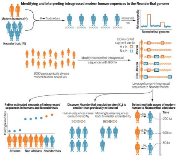 Modern human–to-Neanderthal admixture causes a local increase in heterozygosity in the Neanderthal genome, a characteristic that enabled approaches to quantify and detect introgressed sequences. (Akey, J.et al. / Science)