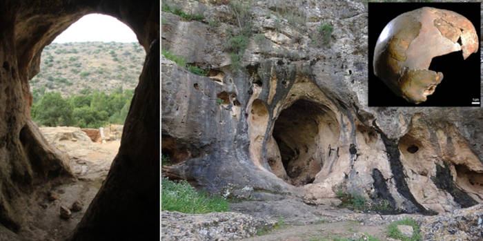 Top image: The entrance to Skhul Cave on Mount Carmel, Israel, where the 140,000-year-old hybrid child fossil was discovered, providing the earliest evidence of Neanderthal-Homo sapiens interbreeding. Inset; Skhul 1 skull. Source: Hanay/CC BY-SA 4.0 Inset; Tel Aviv University