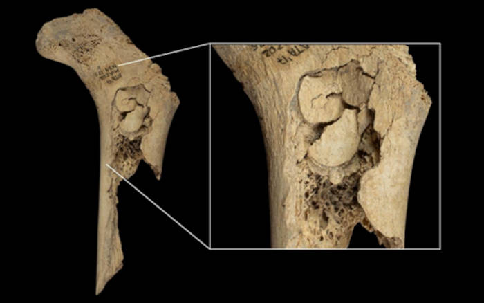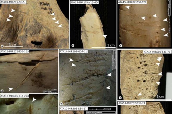 Cut marks (indicated by white arrow) on human remains from El Mirador cave, showing evidence of systematic butchery. (Scientific Reports)