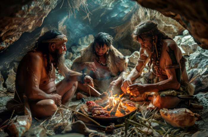 Top image: Tribe of Prehistoric Hunter-Gatherers Wearing Animal Skins Grilling and Eating Meat in Cave. Source: Hunman/Adobe Stock