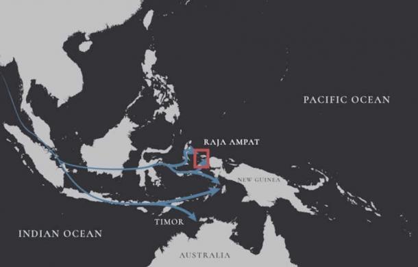Two possible seafaring pathways from Asia to the Pacific region: a northern route along the equator to Raja Ampat and a southern route via Timor to Australia. (Dylan Gaffney/ CC BY-SA)