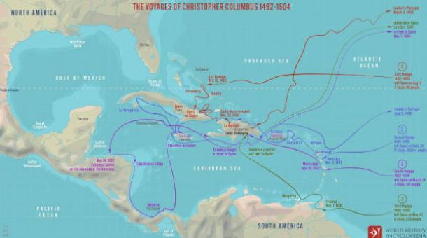 Sea routes traveled by Christopher Columbus on his travels back and forth between Europe and the Americas, 1492-1504. (Simeon Netchev/World History Encyclopedia).