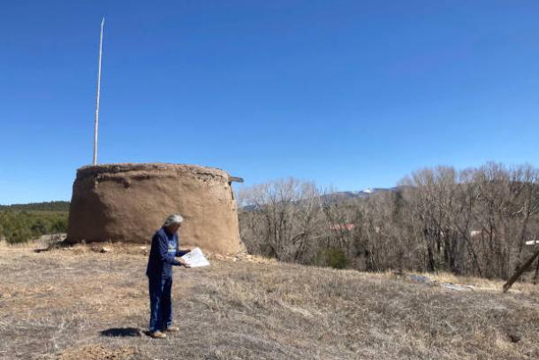 Picuris elder Clifford Tsosie in front of Round House in Picuris Pueblo, NM, which is one of the Picuris' ritual rooms, used for rituals and meetings. (Pinotti, et. al/Nature).