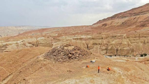 Top image: Broad view of excavation site in Nahal Zohar valley, with excavation site on upper section of pyramidal structure visible in the center.