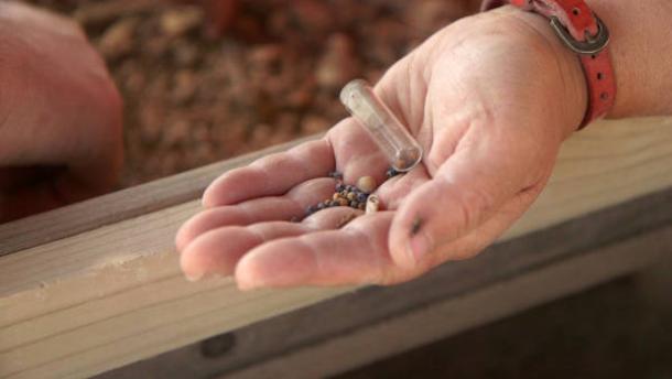 Handful of colored beads excavated at site. (Emil Aladjem/Israel Antiquities Authority).