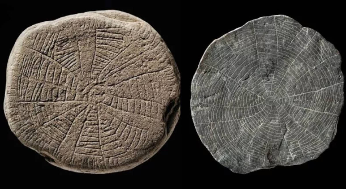 Top image: Two sun stones found on the Danish island of Bornholm in the Baltic Sea. The prehistoric artifacts are small, flat, shale pieces with finely incised patterns and sun motifs.
