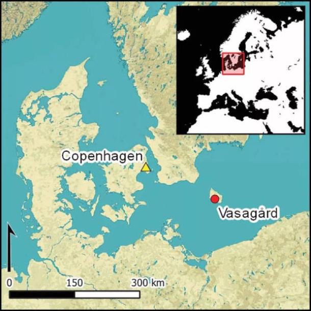 Map showing the location of the archaeological site of Vasagård on Bornholm. The sun stones found at the site have been linked to a prehistoric volcanic eruption in a study. (University of Copenhagen/Antiquity Publications Ltd.)