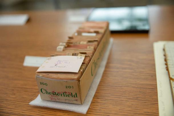 Brooklyn College scholar Alice Kober catalogued individual symbols found in Linear B and identified both their frequency in the tablets and their juxtaposition to other symbols. She stored the notecards — more than 180,000 of them — in old cigarette boxes. (Photo/Andrew Higley/UC Marketing)
