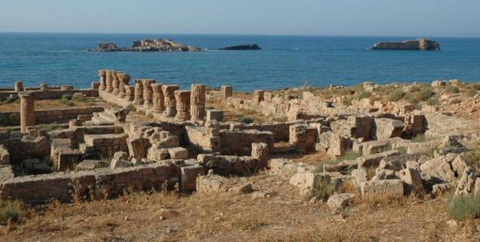 Top image: Remains of mole (background) and bath house (foreground) of the ancient harbor town of Apollonia, Libya. The circular harbor basin which reached in antiquity as far as the rocks in the background was largely swallowed by the sea in the 365 AD Crete earthquake. Source: Jona Lendering/CC BY-SA 3.0