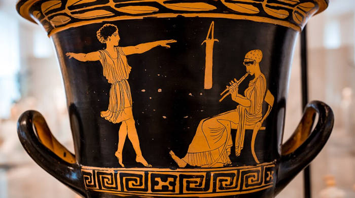 Top image: A dancing girl and woman (music teacher) seated on chair playing auloi on red and black ceramic. Source: ArchaiOptix/CC BY-SA 4.0