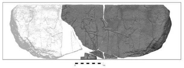 3D model of the relief: King Ashurbanipal is in the center, flanked by Ashur on the left and Ishtar on the right, with both being followed by a fish genius and a supporting figure with raised arms. (Michael Rummel/ Heidelberg University).