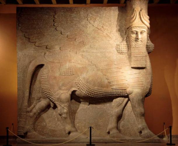 A human-headed winged bull known as a lamassu from Dur-Sharrukin. Neo-Assyrian Period, ca. 721–705 BC (Trjames /CC BY-SA 3.0)
