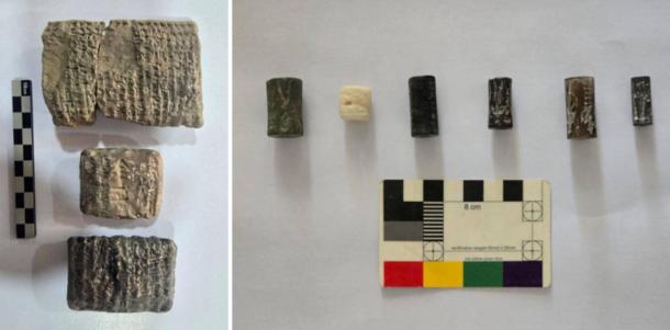 Left; Cuneiform script tablets. Right; Cylinder seals. (Iraq’s State Board of Antiquities and Heritage)