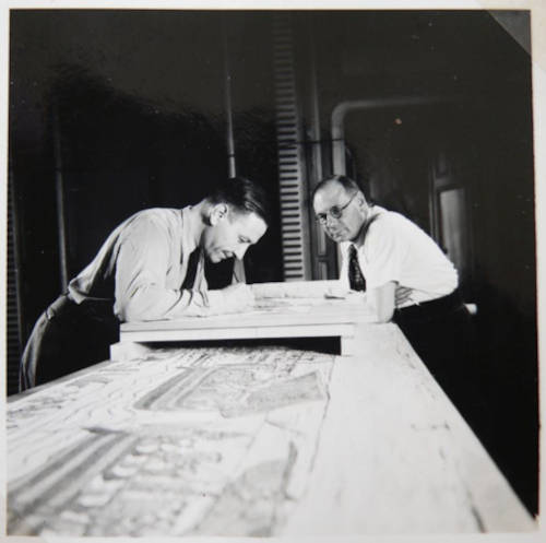 Karl Schlabow, right, studies the tapestry in 1941. (Bayeux Museum/The Conversation)