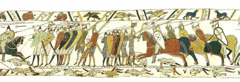 A segment of the exquisite Bayeux Tapestry. In this scene Odo, Bishop of Bayeux (with raised club), half-brother to William the Great, rallies the troops in the Battle of Hastings in 1066. (Public Domain)