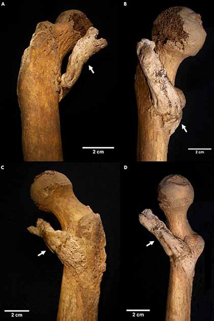 The lump of excess bone was alarmingly big, having grown to about three inches (8 cm) in size at the time of the woman’s death. The massive growth was on the woman’s right femur (the left femur was actually missing), right at the spot where the pectineus muscle connects the inner thigh bone to the pubic bone. This is an awkward location, and the presence of the injury and associated bone spur would have made it impossible for the unfortunate woman to move around comfortably.